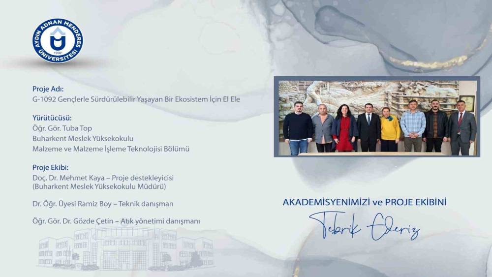 Gençlik ve Spor Bakanlığı Eğitim, Araştırma ve Koordinasyon Genel Müdürlüğü tarafından desteklenen "Gençlerle Sürdürülebilir Yaşayan Bir Ekosistem İçin El Ele" başlıklı proje, Aydın Adnan Menderes Üniversitesi Buharkent Meslek Yüksekokulu tarafından hazırlanarak onaylandı ve uygulama sürecine alındı. "G-1092 Gençlerle Sürdürülebilir Yaşayan Bir Ekosistem İçin El Ele" adlı proje, ADÜ Buharkent Meslek Yüksekokulu Malzeme ve Malzeme İşleme Teknolojisi Bölümü Öğretim Görevlisi Tuba Top yürütücülüğünde hayata geçirilecek. Gençlik ve Spor Bakanlığı’nın "Gönüllüyüz Biz" Proje Destek Programı kapsamında kabul edilen proje, üniversite ve ortaöğretim öğrencilerini sürdürülebilirlik ve çevresel farkındalık odağında bir araya getirmeyi amaçlıyor. Buharkent Meslek Yüksekokulu Müdürü Doç. Dr. Mehmet Kaya’nın destekleriyle yürütülecek projede, Dr. Öğr. Üyesi Ramiz Boy teknik danışman, Öğr. Gör. Dr. Gözde Çetin ise atık yönetimi danışmanı olarak görev alıyor. Proje kapsamında, atıkların çevreye zarar vermeden önce kaynağında ayrıştırılması ve etkin biçimde yönetilmesi yaklaşımı esas alınıyor.