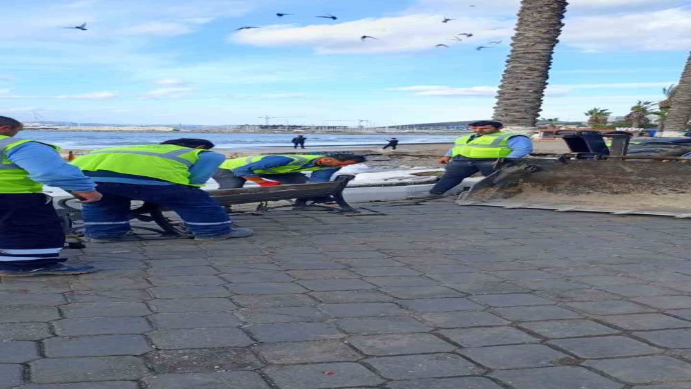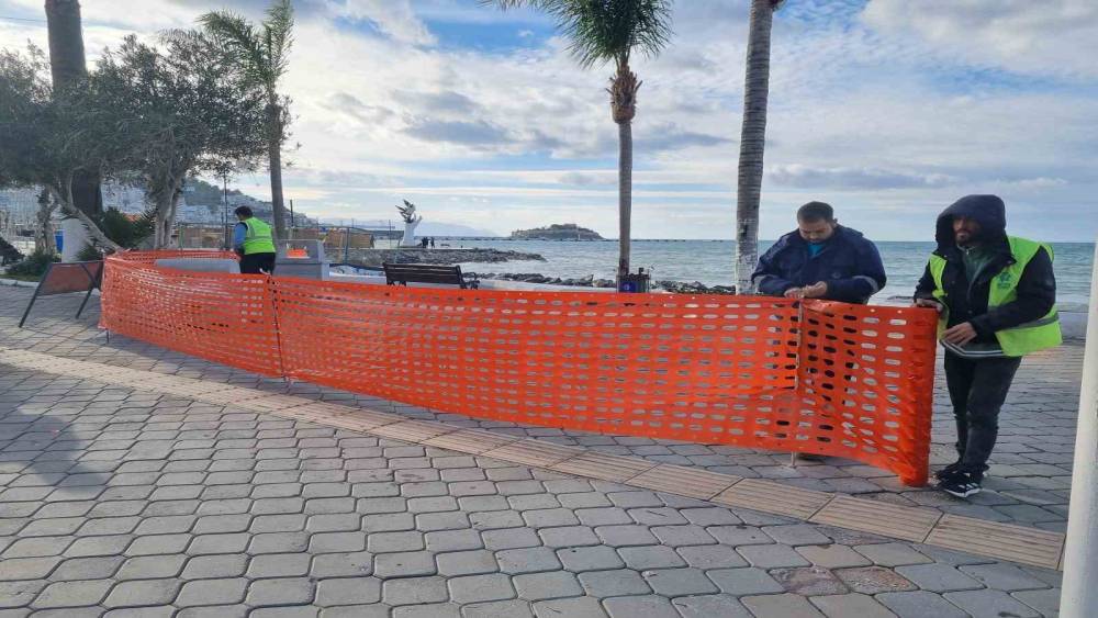 Kuşadası Atatürk Bulvarı sahil şeridinde, kuvvetli dalgalar ve olumsuz hava şartlarının ardından oluşan hasarların giderilmesi amacıyla çalışma başlatıldı.