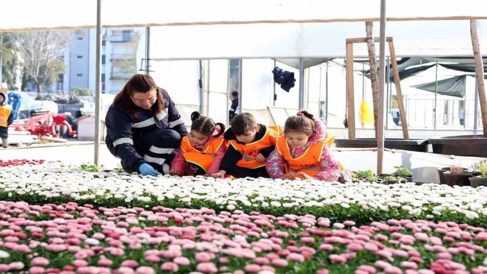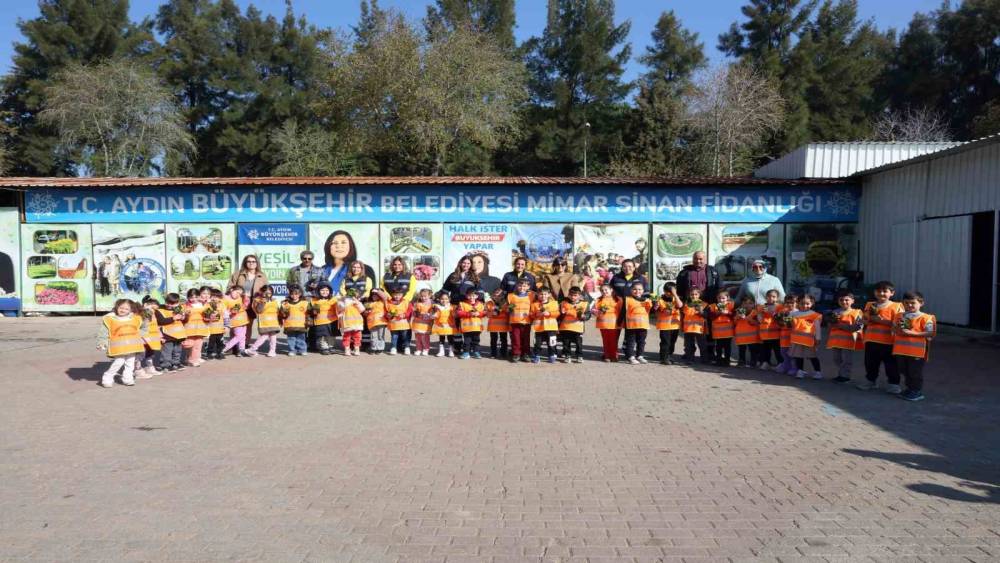 Cumhuriyet İlkokulu anasınıfı öğrencileri ve öğretmenleri, derslerini Aydın Büyükşehir Belediyesi’nin Mimar Sinan Mahallesi’ndeki fidanlığında işledi.