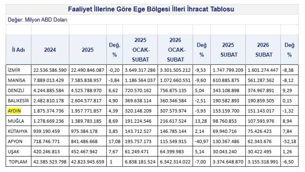 Öte yandan yıllık verilere göre Aydın’ın toplam ihracatında artış dikkat çekti. 2024 yılında 1 milyar 875 milyon dolar olan ihracat, 2025 yılında yüzde 4,39 artışla 1 milyar 957 milyon dolara yükseldi. Aydın’ın ihracat performansında yıllık bazda artış görülse de, 2026 yılına aylık bazda düşüşle başlanması dikkat çekti.