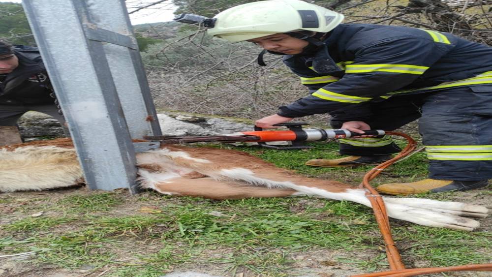 Muğla’nın Milas ilçesinde aydınlatma direğine sıkışarak mahsur kalan buzağıyı itfaiye ekipleri kurtardı.