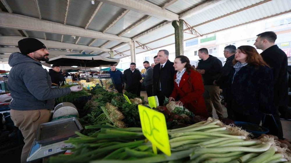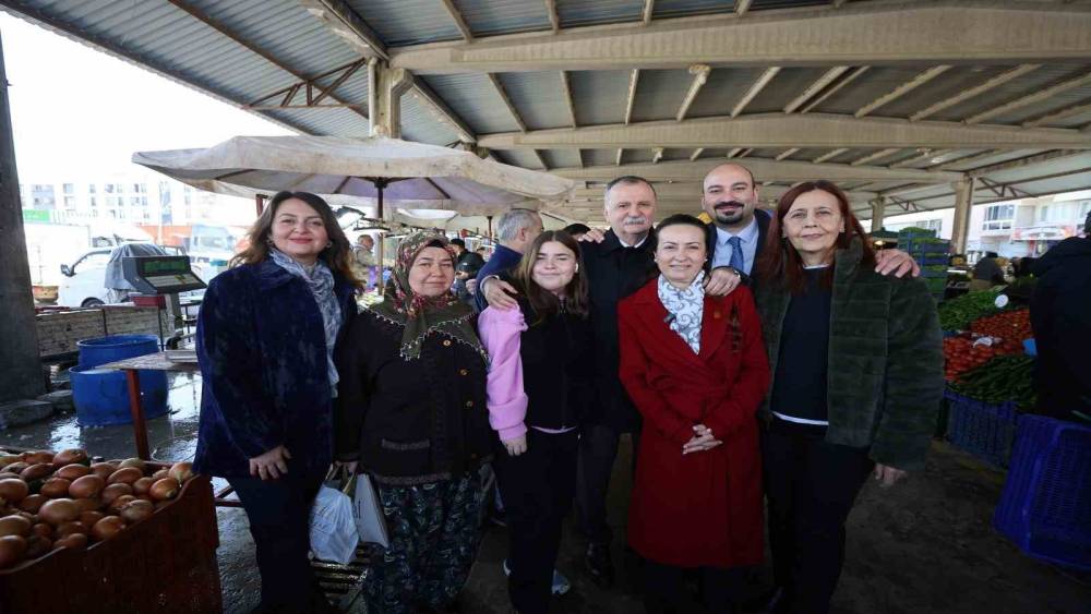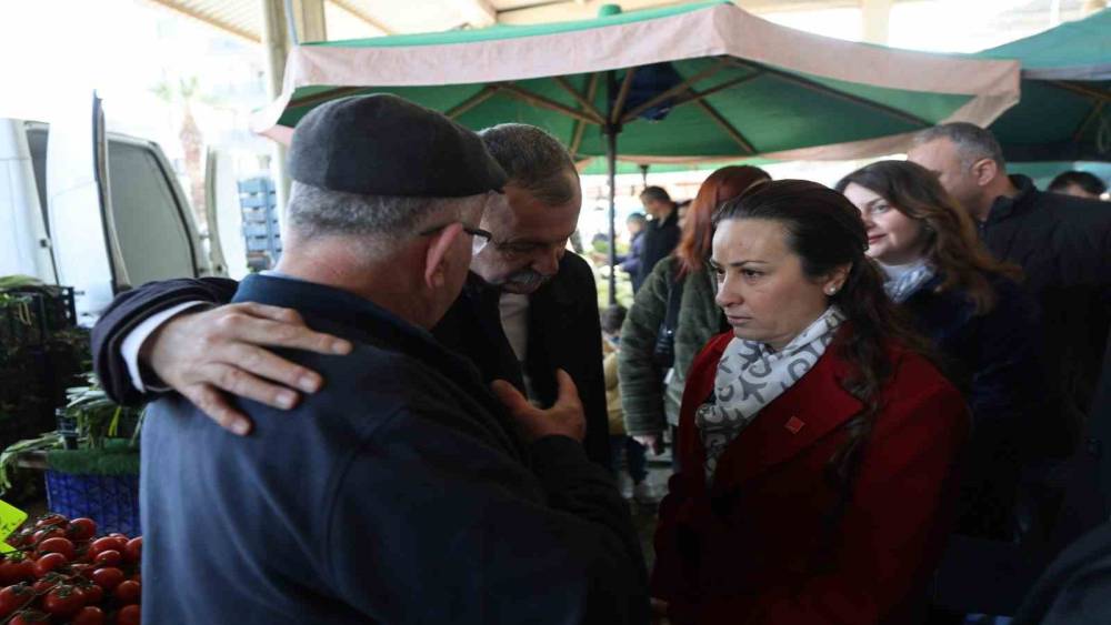 Yunusemre Belediye Başkanı Semih Balaban, CHP Manisa İl Başkanı İlksen Özalper ile birlikte Muradiye Mahallesi Pazar Yeri’nde tezgâh açan esnaf ve alışveriş yapan vatandaşlarla bir araya geldi. Pazar tezgâhlarını tek tek dola-şan Başkan Balaban ve İl Başkanı Özalper’e; CHP Yunusemre İlçe Başkanı Yal-çın Arcak, Belediye Başkan Yardımcısı Emine Özge Arslan, belediye meclis üyeleri, Özel Kalem Müdürü Seyit Ali Özmen ve Muradiye Mahalle Muhtarı Eyüphan Aykıran da eşlik etti. Ziyaret kapsamında esnafın ve vatandaşların talep ve önerilerini dinleyen Başkan Balaban, iletilen konuların ilgili birimlere aktarılması için not alarak gerekli talimatları verdi.