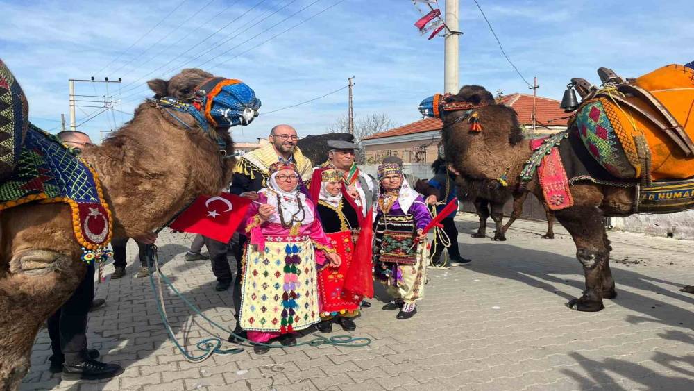 Aydın’ın Germencik ilçesinde develeriyle meşhur Turanlar Mahallesi girişine yaptırılan deve heykeli, davul ve zurna eşliğinde düzenlenen törenle açıldı. Açılışa getirilen develer ise törene renk kattı.