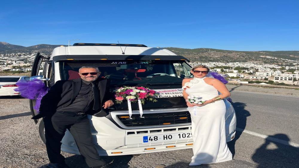 Bodrum’da dünya evine giren Umut Akkaya ile Seminay Akkaya, şehir içi ulaşımda kullandıkları dolmuşu gelin arabasına dönüştürerek ilçede unutulmaz bir gün yaşattı.