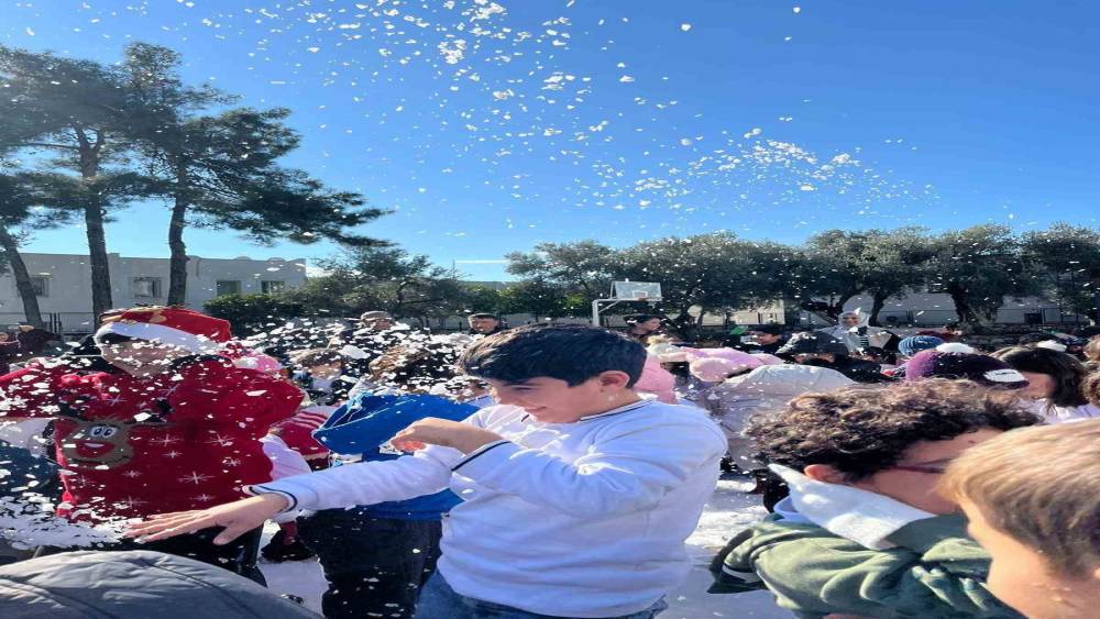 Muğla’nın Bodrum ilçesinde bir ilkokula getirilen yapay kar ile çocuklar gönüllerince eğlendi.