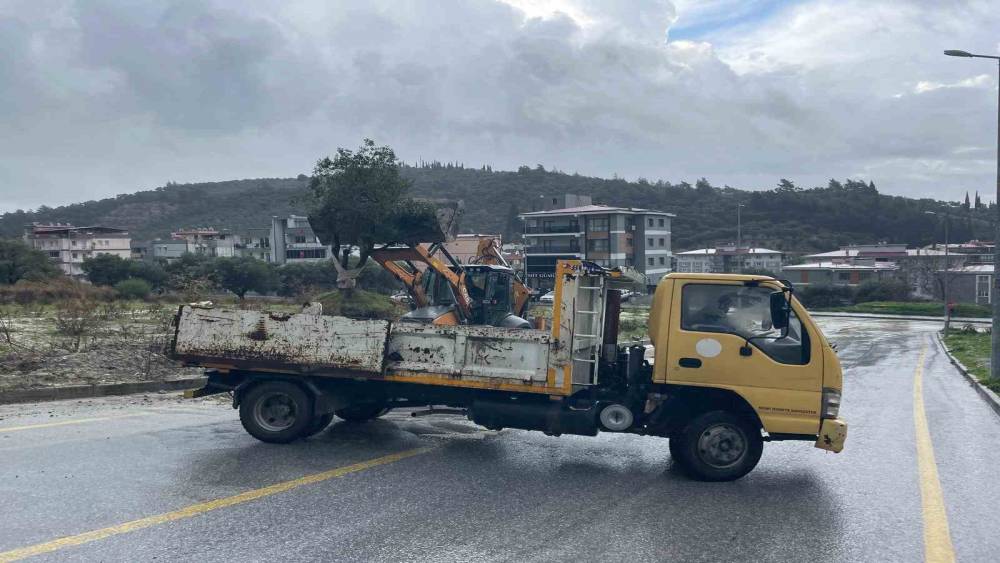 Aydın’ın söke ilçesinde sağanak yağış sonrası köküyle birlikte sel sularının getirdiği zeytin ağacı karayolunu ikiye böldü.