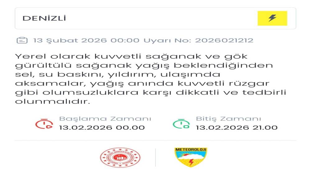 Meteoroloji Genel Müdürlüğü Denizli için kuvvetli sağanak ve gök gürültülü yağışlar nedeniyle sel, su baskını, yıldırım ve ulaşımda aksama uyarısında bulundu.Meteoroloji Genel Müdürlüğü, Denizli için kuvvetli sağanak ve gök gürültülü sağanak yağış uyarısında bulundu. Yapılan açıklamaya göre, 13 Şubat 2026 Cuma günü saat 00.00’dan aynı gün 13 Şubat 2026 Cuma akşam 21.00’a kadar, Denizli genelinde aralıklı ve yerel olarak kuvvetli sağanak ve gök gürültülü sağanak yağış bekleniyor. Meteoroloji, beklenen kuvvetli yağışlarla birlikte sel ve su baskını, yıldırım, ulaşımda aksamalar, yağış anında kuvvetli rüzgar ve yerel dolu yağışı gibi olumsuzluklara karşı vatandaşların dikkatli ve tedbirli olmaları gerektiğini bildirdi. Ayrıca yaşanabilecek olumsuzluklara karşı gerekli önlemlerin alınması konusunda uyarıda bulundu.