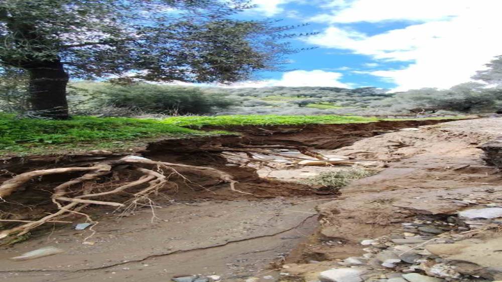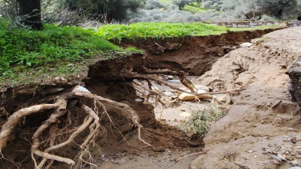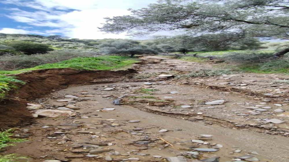 Aydın’ın Efeler ilçesi İlyasdere Mahallesi’nde yoğun yağışlarla birlikte taşan ve yön değiştiren dere, zeytin bahçelerini sular altında bırakırken, toprağın aşınmasıyla birlikte adeta ikinci bir dere yatağı oluştu.