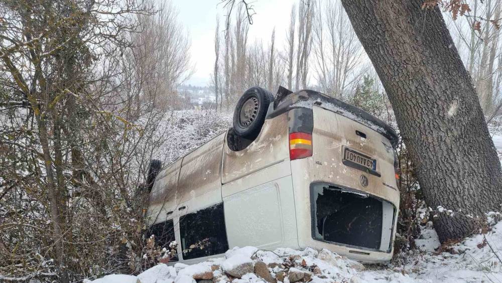 Kütahya’nın Domaniç ilçesinde gizli buzlanma sebebi ile kontrolden çıkan minibüs, şarampole yuvarlanarak takla attı. Yol kenarındaki bir ağaca çarparak durabilen araçta bulunan 2 kişi kazayı yara almadan atlattı.