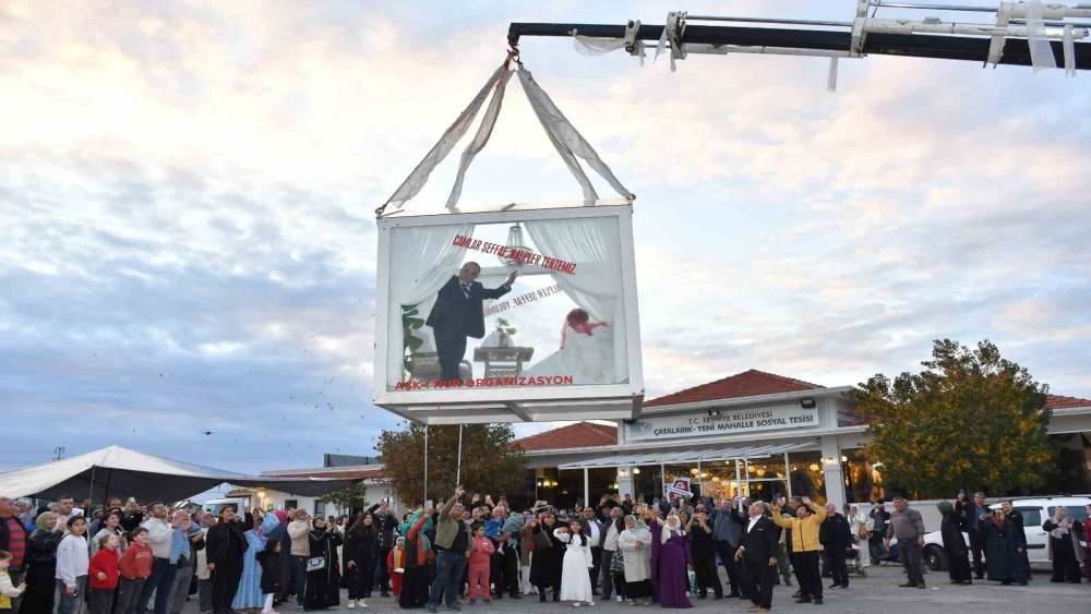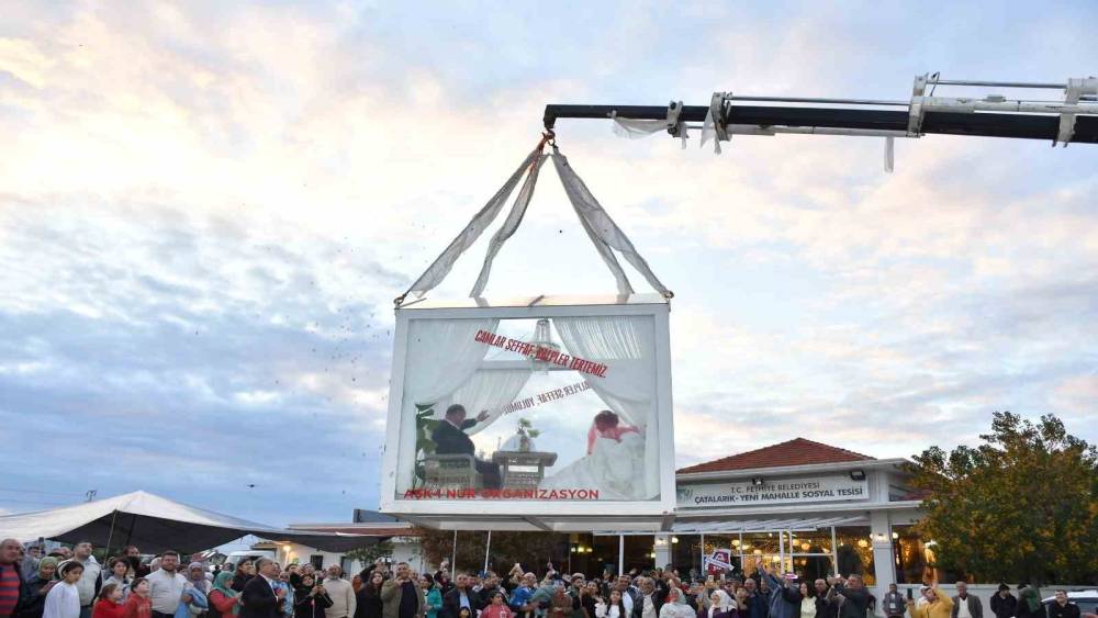 Fethiye ve Seydikemer ilçelerinin siyaset, esnaf ve ticaret dünyasından yoğun katılımın olduğu düğün töreninde gelin almaya özel yaptırılıp tıra yüklenen cam vitrin ile gidildi. Cam vitrin kız evinde vinçle tırdan indirilirken, gelin Merve Sarıman ve damat Berat Çetinkaya dualarla cam vitrine girdi. Cam vitrin vinçle tekrar tıra alkışlar arasında yüklendi. Gelini alan damat tarafları konvoy eşliğinde Seydikemer ilçesinden Fethiye’ye hareket etti. Tırda gelin ve damadı cam vitrinde görenler bu anı cep telefonlarıyla görüntülemeye çalıştı. Tır üzerinde cam vitrin içinde Çatalarık Mahallesi sosyal tesislerine çift geldiğinde çok sayıda davetli alkış tuttu. Cam vitrin içindeki çift burada da vinç yardımıyla tırdan yine alkışlar arasında indirildi.
