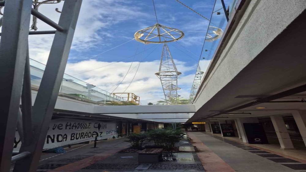 Gölgelik olarak kullanılan brandaların günler önce yırtıldığı Oasis Alışveriş Merkezi’nde, bugün brandaları taşıyan direklerin şiddetle sallandığı ve devrilme riski oluşturduğu görüldü. Tehlikenin artması üzerine AVM yönetimi, orta bölüm ve çevresini kapsayan alanı tahliye etti.