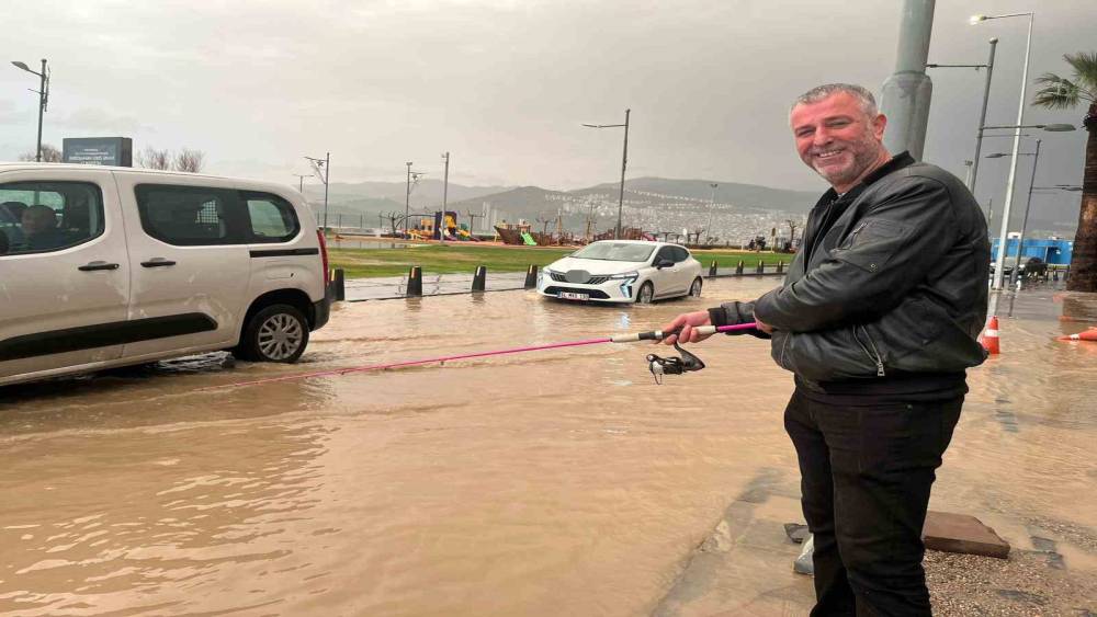 İzmir’de öğle saatlerinde etkili olan sağanak yağış hayatı olumsuz etkiledi. Konak ilçesi Alsancak Kordon Boyu’nda altyapıdan kaynaklı su baskınları yaşanırken, caddelerin göle döndüğü bölgede bir vatandaş duruma oltasını suya atarak tepki gösterdi.