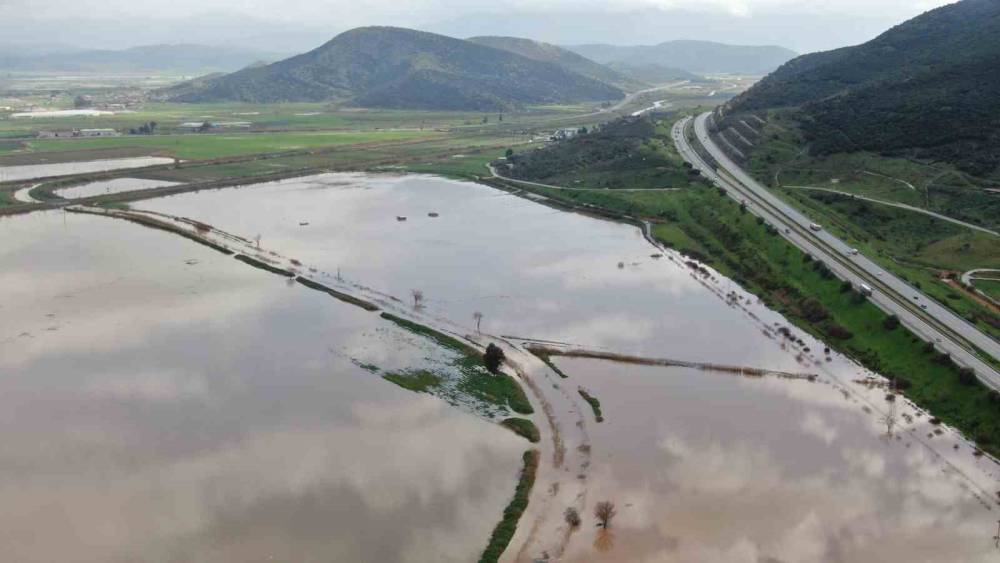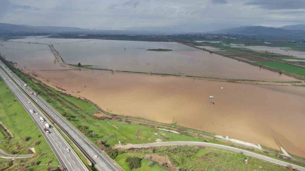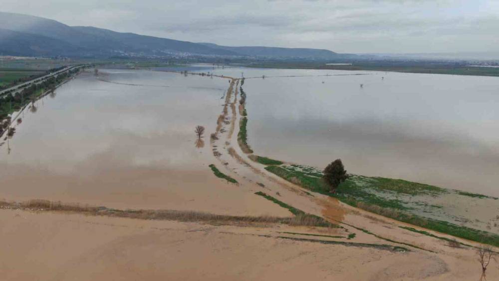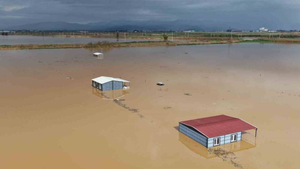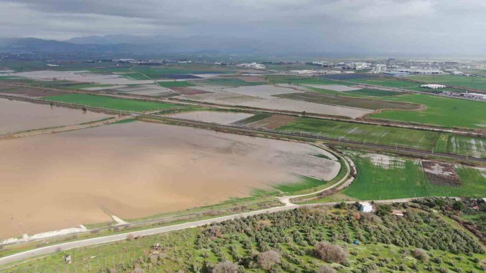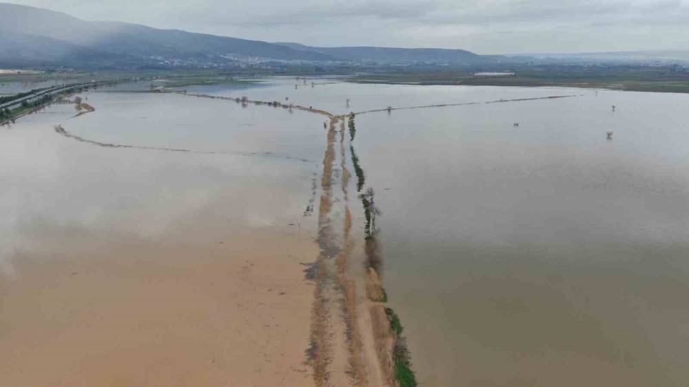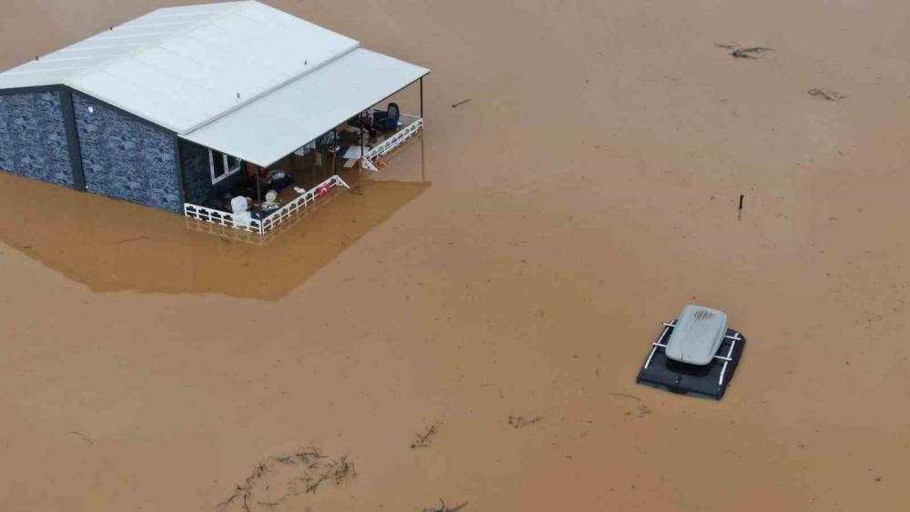 Taşkının meydana geldiği araziler ve hobi bahçeleri dron ile görüntülendi. Kaydedilen görüntülerde, ovanın büyük bir bölümünün suyla kaplandığı, bölgedeki hobi bahçelerinin su altında kaldığı ve bir otomobilin yükselen suların ortasında kaldığı yer aldı.
