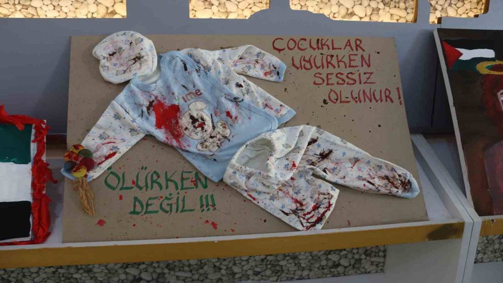 Programın en dikkat çeken bölümlerinden biri, öğrencilerin Gazze’de şehit düşen çocuklar için hazırladığı resim sergisi oldu. Protokol üyeleri ve davetliler tarafından gezilen sergide, çocukların gözünden savaşın acı yüzü ve masumiyetin yansımaları incelendi.