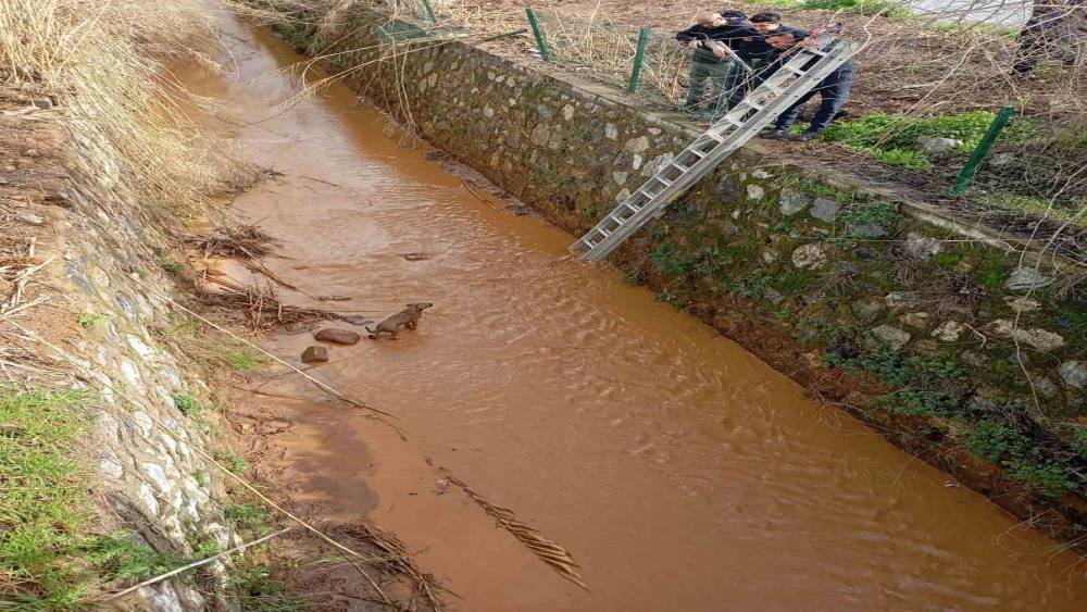 Aydın’ın Efeler ilçesinde sulama kanalına düşen köpeği Aydın Büyükşehir Belediyesi İtfaiye Daire Başkanlığı ekipleri kurtardı.