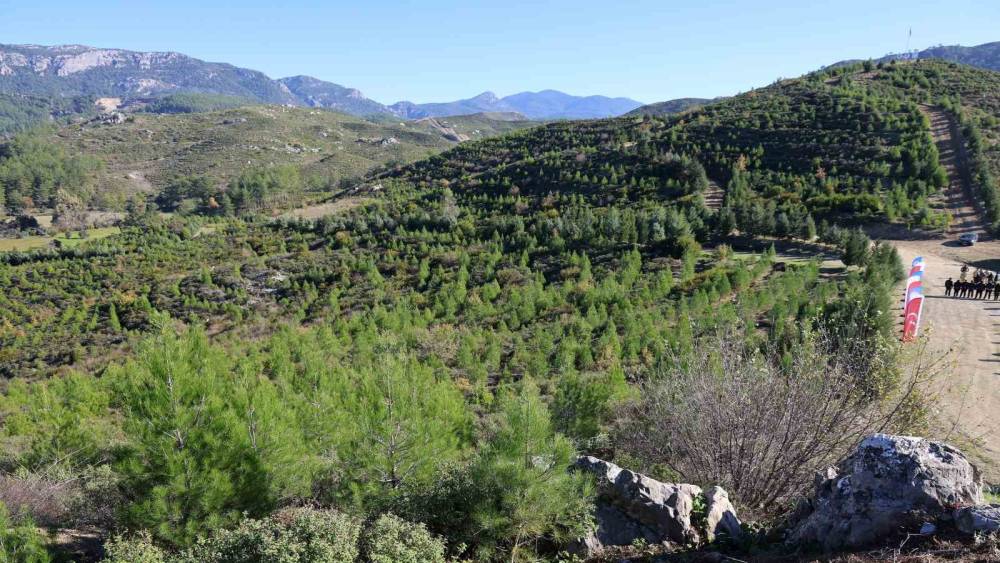 Yanan sahada fidanların ağaca dönüşmesini havadan helikopter ile gören Orman Genel Müdürü Bekir Karacabey, "Burası içinde bulunduğumuz saha maalesef 10 Temmuz 2019 gününde bir yangına maruz kalmış ve o zaman için hepimizi üzüntüye boğan bir sahaydı. Burası tekrar, o zaman ifade ettiğimiz gibi tekrar yeşil dokusuna, yeşil örtüsüne kavuştu. Tabii bu arada kayıp olan şey sadece yıllar değildi, bu yeşilliğin kaybolmasıyla ilgili birçok ağacımızla birlikte bu alanda bulunan birçok canlı, gördüğümüz görmediğimiz birçok canlı da hayatını kaybetmişti. Biz yanan alanlarımızın, yanan orman alanlarımızın tamamını tek bir metre karesi istisna olmaksızın yeniden ağaçlandırıyoruz, yeniden ormanlaştırıyoruz. İşte onun örneklerinden bir tanesini de burada hep birlikte şahit oluyoruz. 2019 yılında hemen 11 Kasım’ına geldiğimizde biliyorsunuz Milli Ağaçlandırma Günü 2019 yılında ilan edildi ve bizler burada 11 Kasım 2019 tarihinde Milli Ağaçlandırma Günü’nü kutlamak maksadıyla sahaya geldiğimizde sahanın tamamında arazi hazırlığı yapılmış, toprak işlemesi tamamlanmış, yeniden ağaçlandırmaya, yeniden fidan dikimine hazır hale getirmiştik. 450 bin fidan ve 35 ton tohumu da bu sahada toprakla buluşturarak şu anda hepimizi memnun eden görüntünün oluşmasını sağlamış olduk. Yanan alanlarda hemen ilk öncelikle sahadaki yanan ağaçları sahadan çıkardıktan sonra etüdünü yapıp, burada hangi usulle, hangi yöntemle tekrar ormanlaştırma çalışması yapacağımızı planladıktan sonra da en geç bir yıl içerisinde bu alanların tekrar ormanlaştırılmasıyla ilgili çalışmaları yürütüyoruz. Bugüne kadar ülkemizin hiçbir yanan alanın hiçbir metrekaresinde ormanlaştırma çalışmalarının dışında herhangi bir müdahale olmamıştır. Bunu tekrar tekrar ifade etmek istiyorum çünkü maalesef vatandaşlarımızın zihninde yanan alanların ormanın dışında maksatlarla kullanılacağıyla ilgili bir takım istifamlar, şüpheler oluşuyor. Bunu ortadan kaldırmış olmak adına tekrar ifade etmek istedim" dedi.