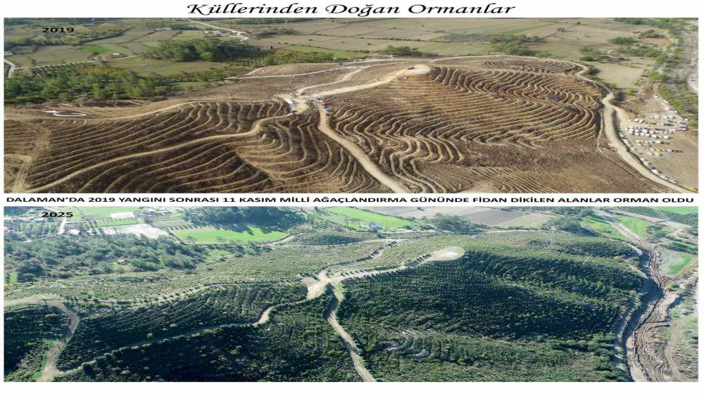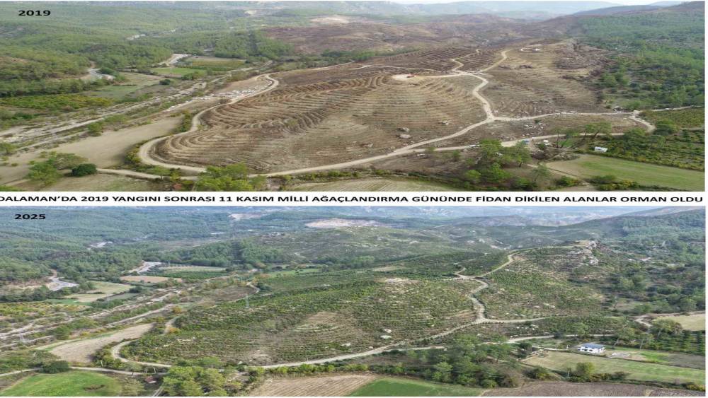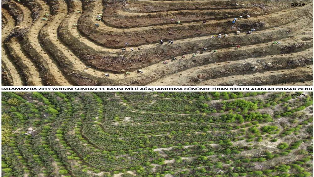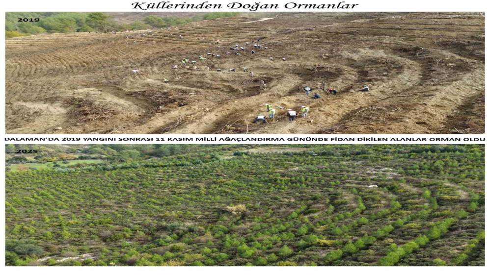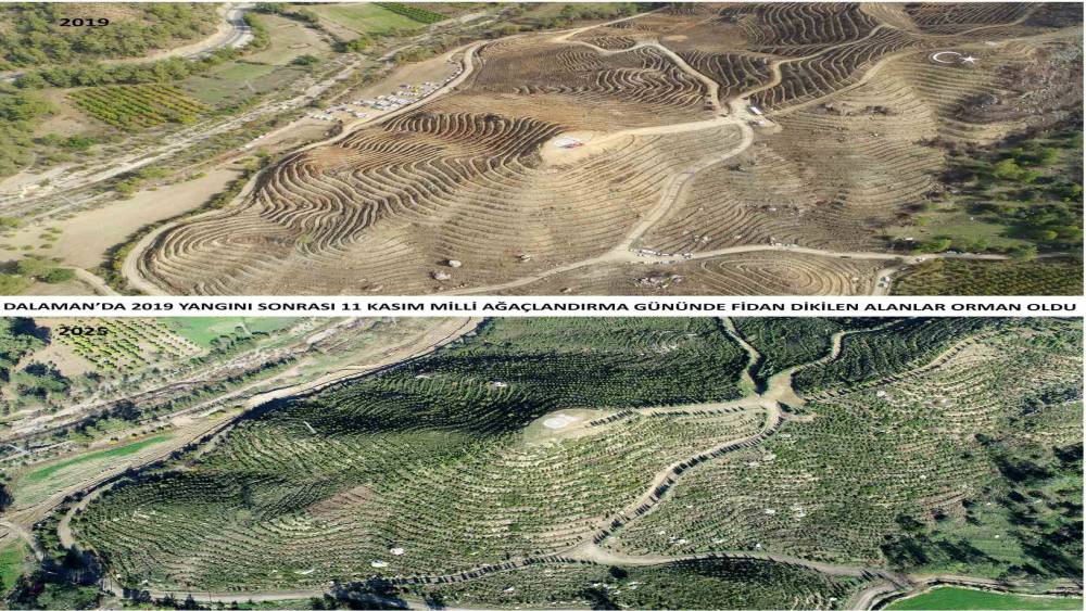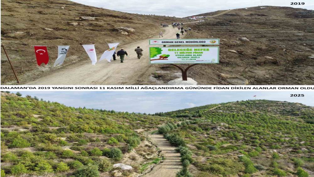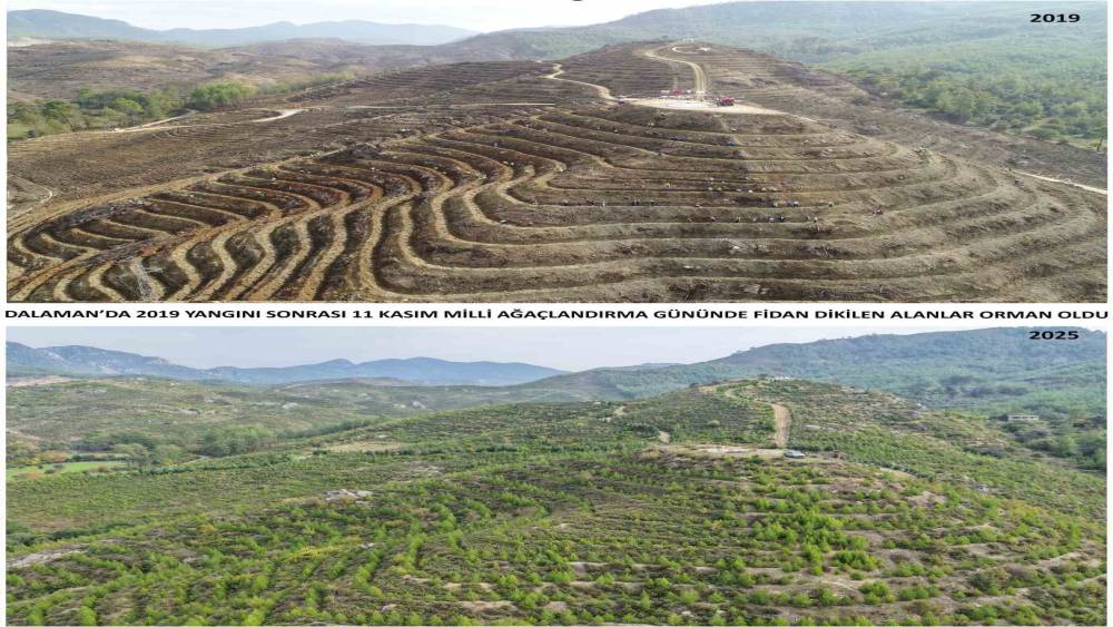 Dalaman-Göcek yangınında yanan bin 433 hektar alanın tekrar ağaçlandırılması çalışmaları kapsamında yaklaşık 450 bin fidan dikildi ve alana yaklaşık 35 ton tohum atıldı. Dalaman’da 11 Kasım 2019’da dikilen fidanlar aradan geçen 6 yılda büyüdü ve yer yer 3 metreye bulan boylarıyla genç ağaçlara dönüştü.