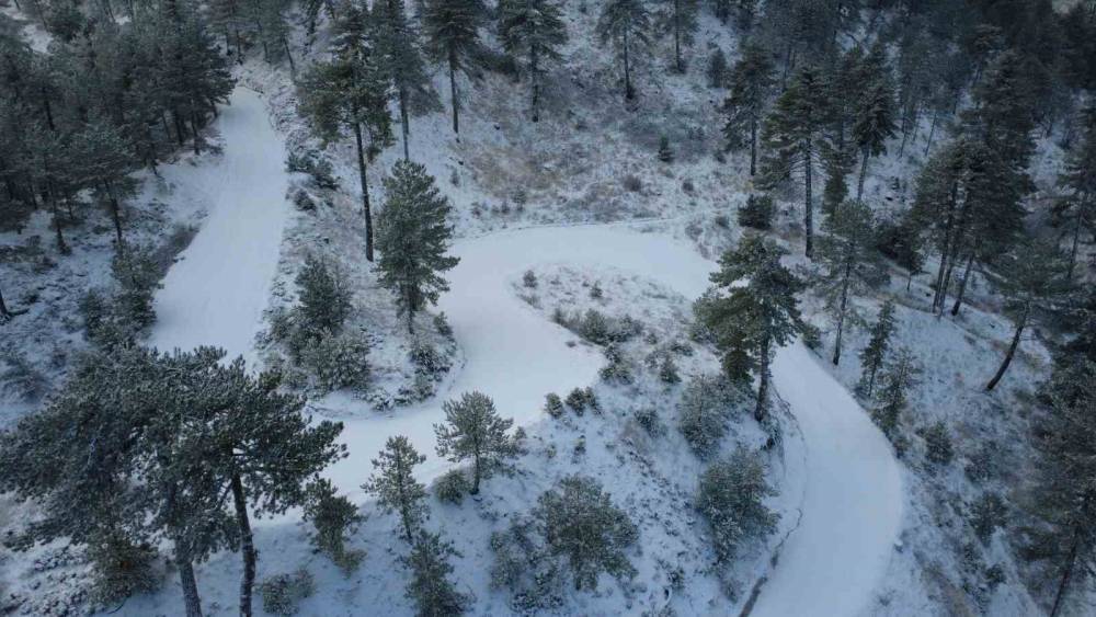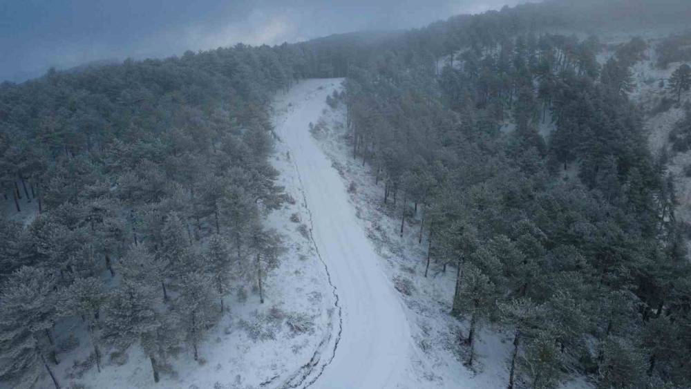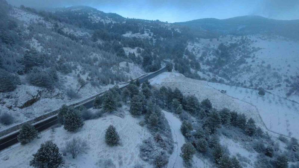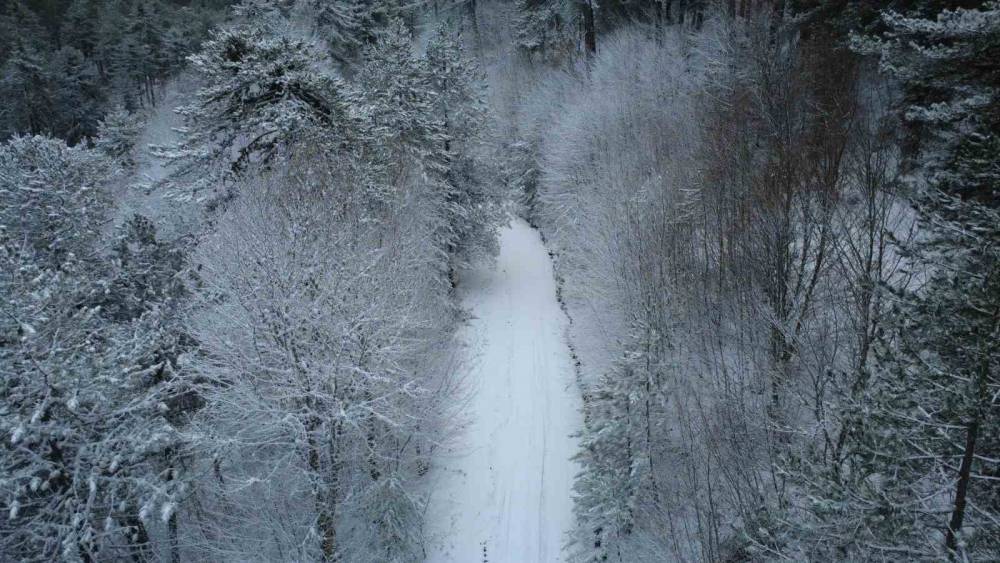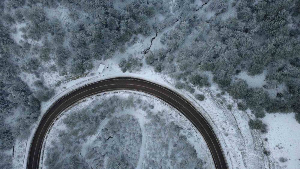 Drone ile kaydedilen görüntülerde, karla kaplanan dağ silsileleri, ormanlık alanlar ve kıvrılarak uzanan yollar görsel bir şölen sundu.
