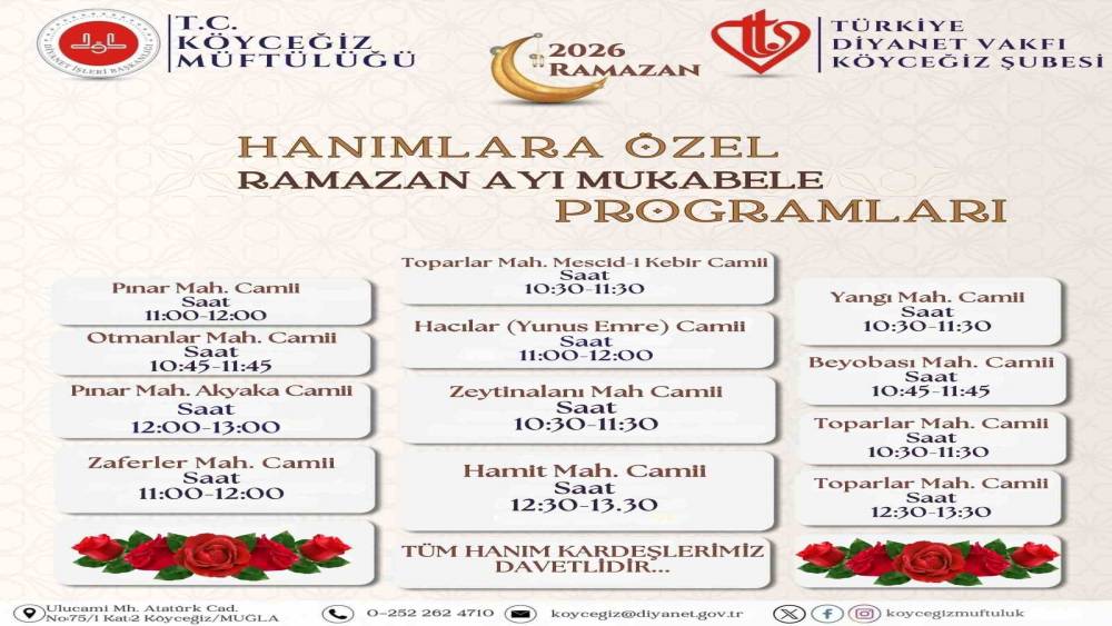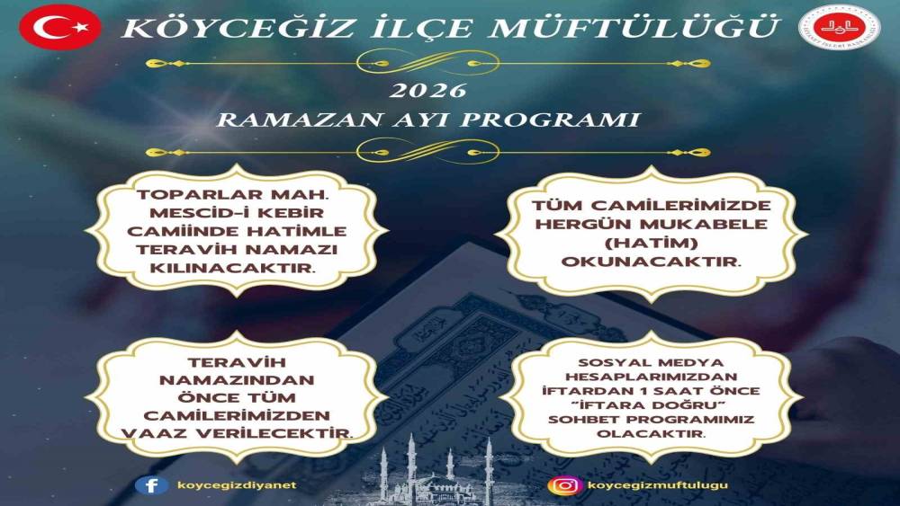 18 Şubat 2026 Çarşamba günü akşam ilk teravih namazı kılınıp gecesinde ilk sahur yapılıp 19 Şubat 2026 Perşembe günü de farz olan Ramazan orucu tutulacak. Köyceğiz’de Diyanet İşleri Başkanlığının belirlediği 2026 yılı Ramazan Ayı teması olan "Ramazan Cami ve Hayat" kapsamında gündüzleri oruç ile teravihler, mukabeleler, sahurlar, iftarlar, fitreler, zekatlar, fidyeler, yardımlar ile Ramazan ayı anlamlı ve unutulmaz kılınacak. Bu sene de Köyceğiz’de Hatimle teravih namazı kılınmaya devam edilecek olup Toparlar Mescid-i Kebir Camiinde Uzman İmam-Hatip Hafız Ramazan Tokcan Hoca camisinde ramazan ayı boyunca hatimle teravih namazlarını kıldıracak. Köyceğiz İlçe Müftülüğünden yapılan açıklamada; "Ramazan ayının kalplerimize huzur, hanelerimize bereket, ailemize, Köyceğiz’imize, Muğla’mıza, ülkemize ve İslâm alemine hayırlar getirmesini temenni ediyoruz. Başta Filistinli kardeşlerimiz olmak üzere tüm zulüm altında olan kardeşlerimizin de biran evvel huzura kavuşmalarını Rabb’imizden niyaz ediyoruz. Hoş geldin on bir ayın sultanı ya Şehr-i Ramazan" ifadeleri kullanıldı.