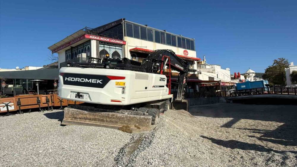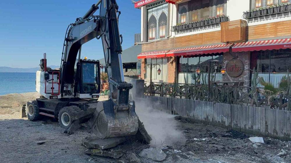 Muğla’nın Bodrum ilçesinde Kumbahçe sahilinde, kamusal alanlardaki işgallerin kaldırılması için başlatılan çalışmalar sürüyor. Ekipler, Azmakbaşı mevkisinde bir işletmenin dere yatağına yaptığı beton su basmanını iş makineleriyle kaldırdı.