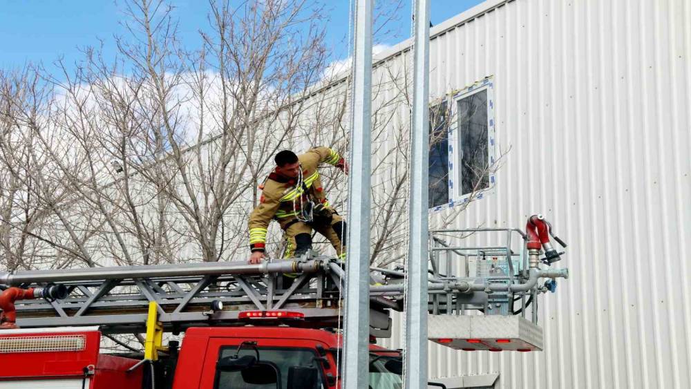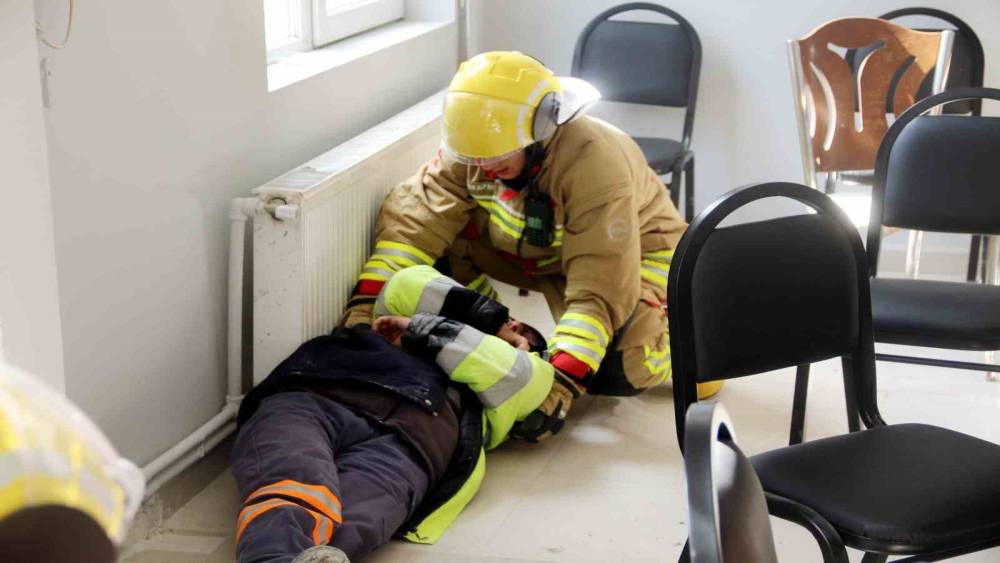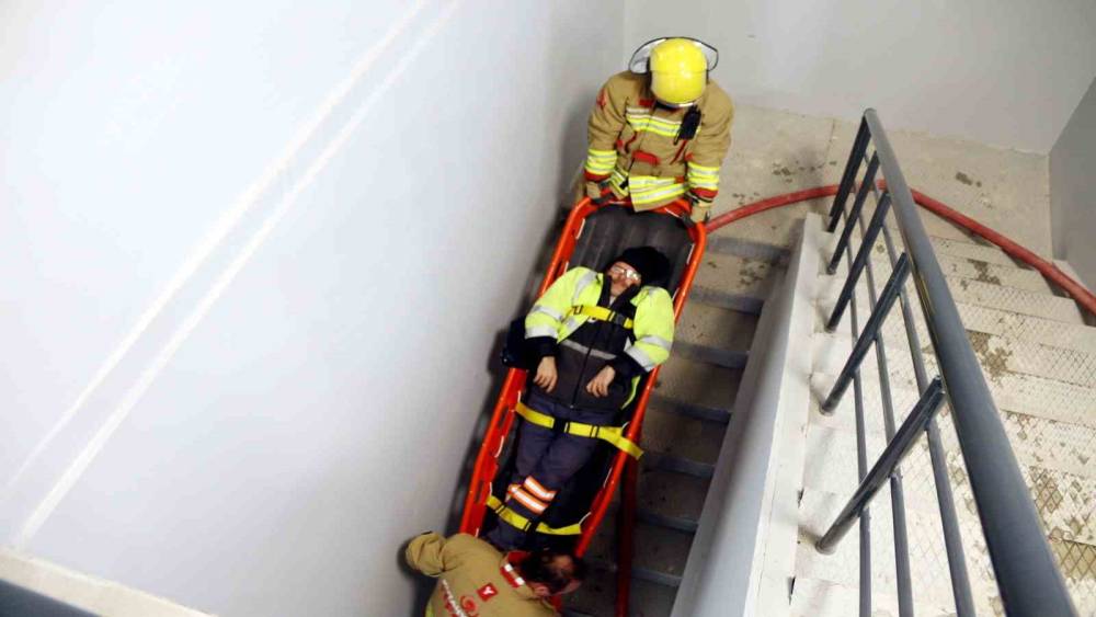 İç mekânda gerçekleştirilen senaryoda ekipler, duman altındaki alanda ilerleme tekniklerini kullanarak yangına kontrollü şekilde müdahale etti. Ardından yaralı personel güvenli biçimde tahliye edilerek sağlık ekiplerine teslim edildi. Merdivenli araç kullanımıyla yüksek kat erişim çalışması da planlı ve disiplinli bir şekilde tamamlandı.