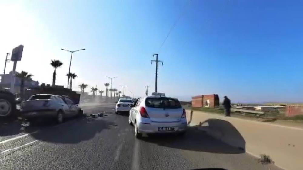Öte yandan, kaza anı, çevredeki bir iş yerinin güvenlik kamerası ile o sırada yoldan geçen bir motosiklet sürücüsünün kask kamerası tarafından saniye saniye kaydedildi. Görüntülerde, otomobilin yeşil ışıkta geçmek için hareket ettiği sırada tali yoldan çıkan traktörün tuğla yüklü römorkuna çarptığı anlar yer aldı.