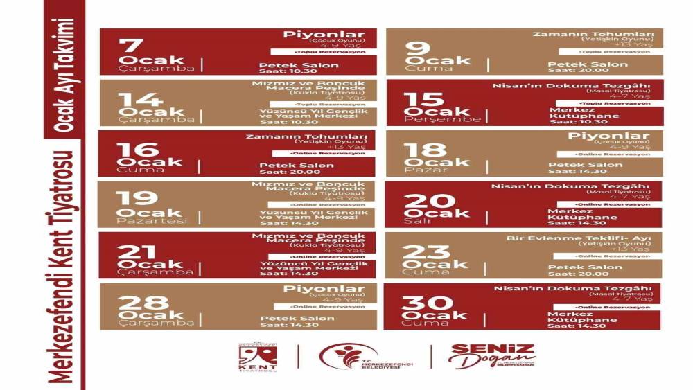 Merkezefendi Kent Tiyatrosu’nun, Ocak ayındaki oyun takvimi ise şöyle; Tiyatro ekibi ardından ‘Zamanın Tohumları’ oyununu 9 Ocak Cuma günü saat 20.00’de Merkezefendi Kültür Merkezi’nde, ‘Mızmız ve Boncuk Macera Peşinde’ oyununu 14 Ocak Çarşamba günü saat 10.30’da Yüzüncü Yıl Gençlik Merkezi’nde, ‘Nisan’ın Dokuma Tezgâhı’ oyunu 15 Ocak Perşembe günü saat 10.30’da Merkez Kütüphane’de, ‘Zamanın Tohumları’ oyununu 16 Ocak Cuma günü saat 20.00’de Merkezefendi Kültür Merkezi’nde, ‘Piyonlar’ oyunu 18 Ocak Pazar günü saat 14.30’da Merkezefendi Kültür Merkezi’nde, ‘Mızmız ve Boncuk Macera Peşinde’ oyununu 19 Ocak Pazartesi günü saat 14.30’da Yüzüncü Yıl Gençlik Merkezi’nde, ‘Nisan’ın Dokuma Tezgâhı’ oyununu 20 Ocak Salı günü saat 14.30’da Merkez Kütüphane’de, ‘Mızmız ve Boncuk Macera Peşinde’ oyununu 21 Ocak Çarşamba günü saat 14.30’da Yüzüncü Yıl Gençlik Merkezi’nde, ‘Bir Evlenme Teklifi - Ayı’ oyununu 23 Ocak Cuma günü saat 20.00’de Merkezefendi Kültür Merkezi’nde, ‘Piyonlar’ oyununu 28 Ocak Çarşamba günü 14.30’da Merkezefendi Kültür Merkezi’nde ve Nisan’ın Dokuma Tezgâhı’ oyununu 30 Ocak Cuma günü saat 14.30’da Merkez Kütüphane’de gerçekleştirilecek.