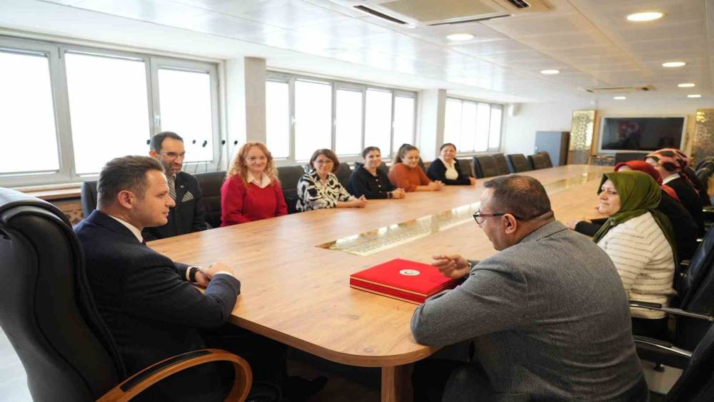 El Sanatları Teknolojisi ve Nakış Atölyesi öğretmenleri ile usta öğreticileri, 2025-2026 eğitim-öğretim yılı ikinci döneminin ilk ders teması olan "Bayrak Sevgisi" kapsamında İl Millî Eğitim Müdürü Emre Çay’ı makamında ziyaret etti.