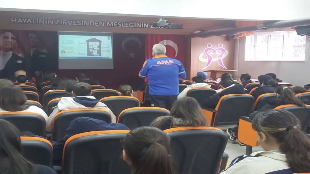 Aydın’da Murat-Hale Küçükoğlu Kız Mesleki ve Teknik Anadolu Lisesi’nde Afet Farkındalık Eğitimi gerçekleştirildi. Eğitimin ardından öğrencilerle birlikte tahliye tatbikatı yapıldı.