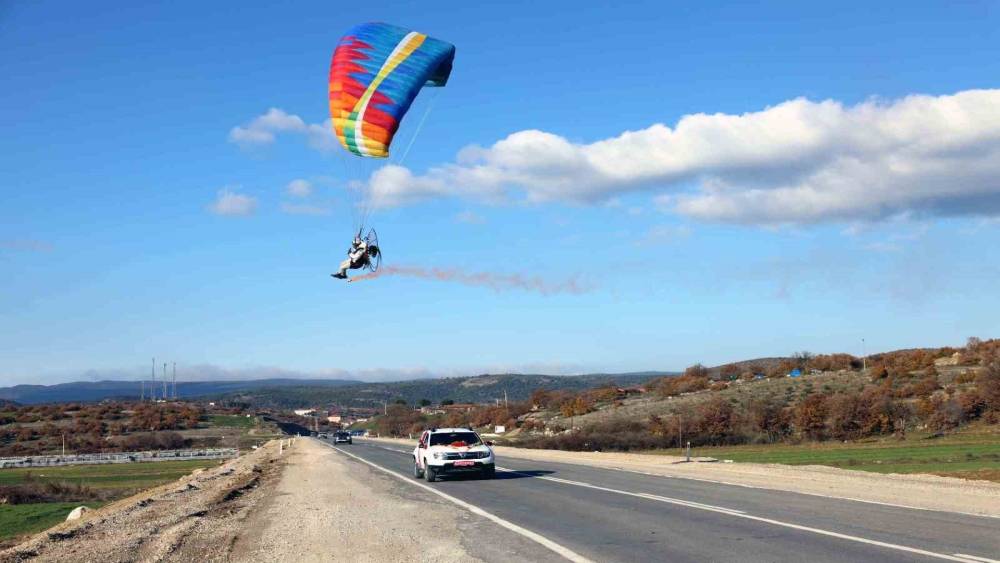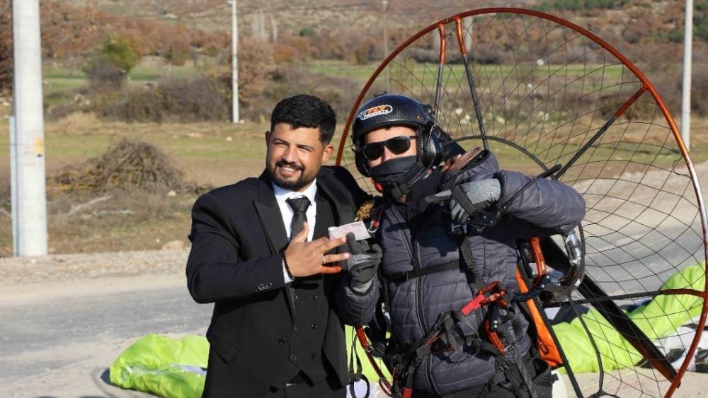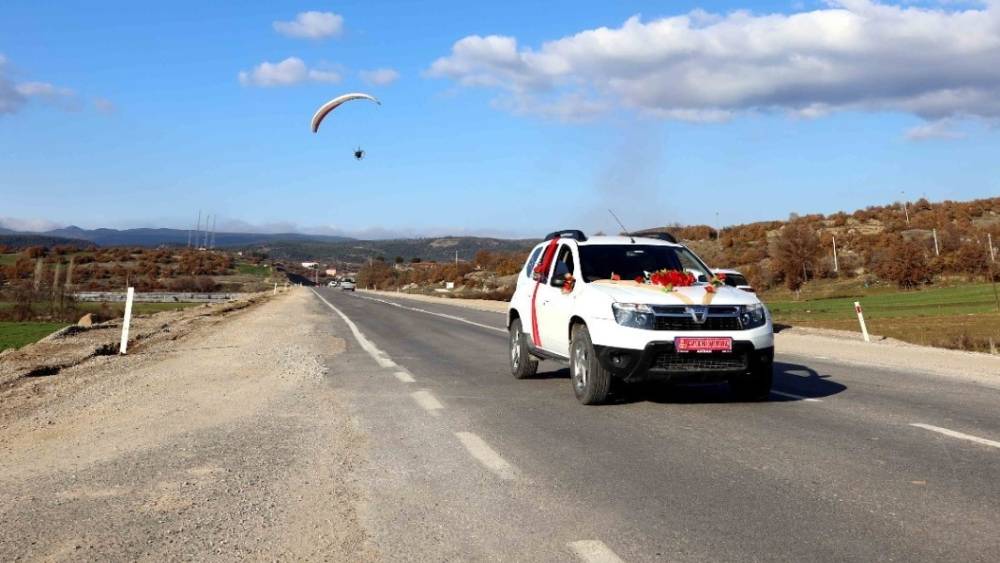 Paramotorla inip gelin arabasının önünü kestiler