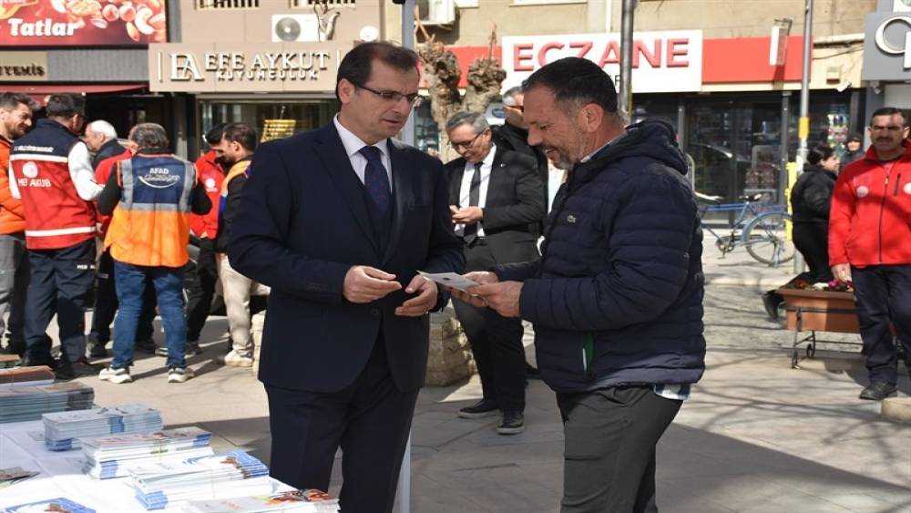 Hamidiye Camii önünde kurulan stantta, kurtarma ekipleri ve ilgili birimlerle birlikte vatandaşlara deprem ve acil durum bilinci kazandırmak için eğitim materyalleri ve broşürler dağıtıldı.