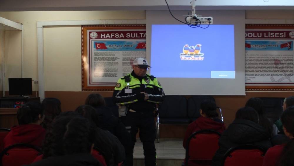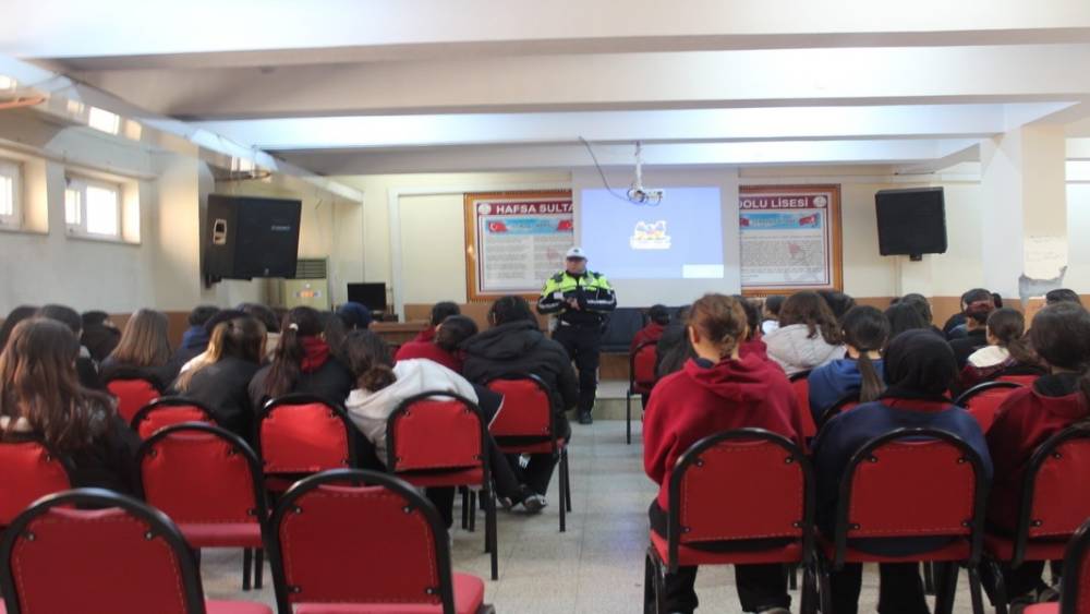 Manisa’nın Salihli ilçesinde polis ekipleri tarafından lise öğrencilerine yönelik trafik güvenliği eğitimi düzenlendi.