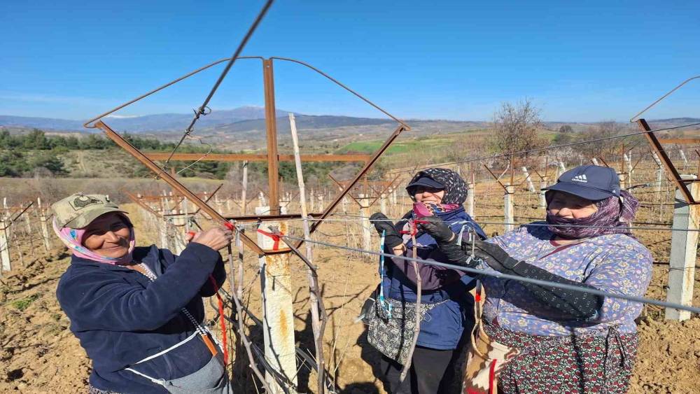 Sarıgöl ilçesinde sabahın erken saatlerinden itibaren üzüm bağlarına giren kadın işçiler, 8 Mart Dünya Kadınlar Günü’nü çalışarak kutladı. İlçenin temel geçim kaynağı olan bağlarda yüksek sistem çubuk bağlama mesaisine katılan kadınlar, günlük yevmiyelerini kazanmak için ter döktü. Sarıgöl’de bağ budama işlemlerinin tamamlanmasının ardından, mart ayının sonuna kadar sürmesi beklenen çubuk bağlama işleri yoğunluk kazandı. 113 bin dekar alan üzerinde 9 farklı türde sofralık üzümün yetiştirildiği ilçede, tarımsal üretimin büyük yükünü her yıl olduğu gibi yine kadınlar sırtladı.