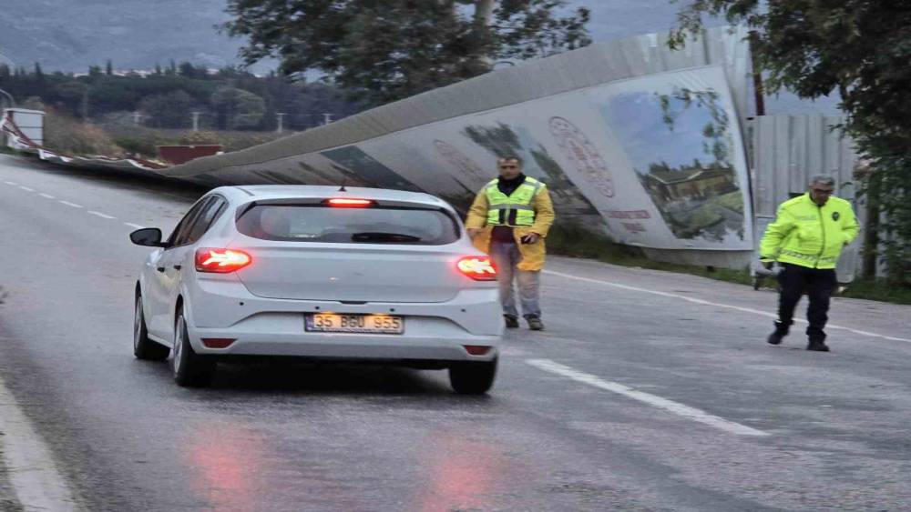Selçuk’ta fırtına yol kenarında dev panoları yola savurdu