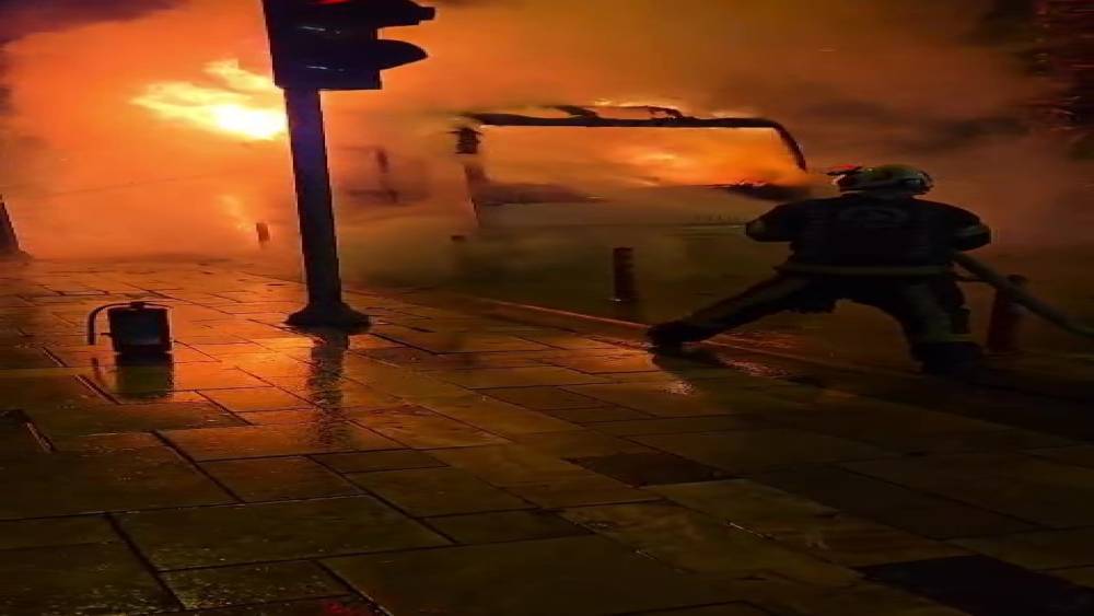 Denizli Organize Sanayi Bölgesindeki işçileri taşıdığı öğrenilen servis aracı yangın sonrası adeta hurdaya döndü. Yangınla ilgili soruşturma başlatıldı.