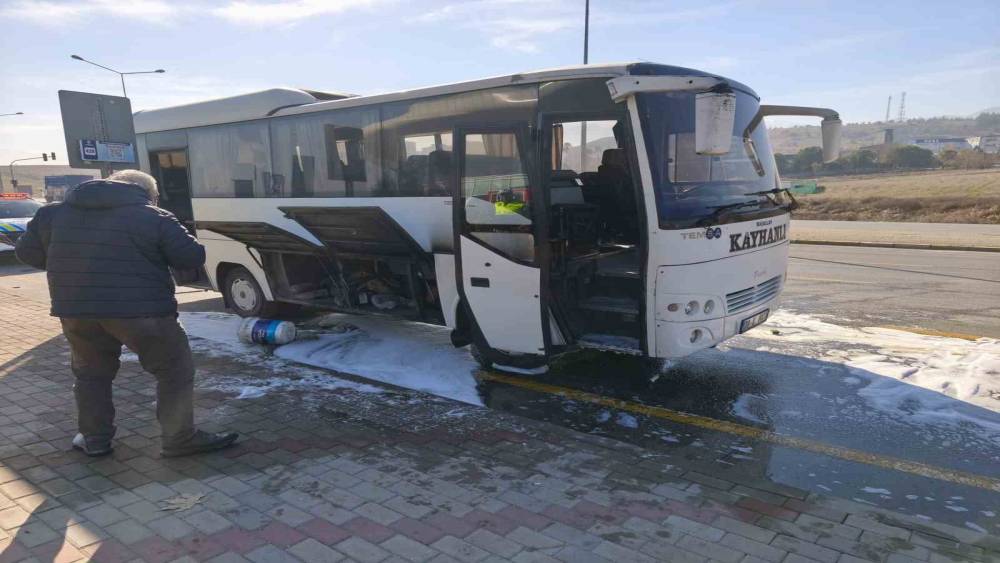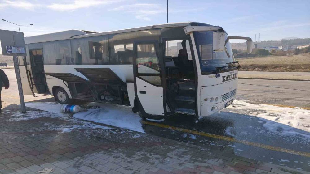 Denizli’de hareket halindeki işçi servisi midibüsü motor kısmından alev aldı. Servis Sürücüsünün yangın tüpüyle müdahalesiyle ve itfaiye ekiplerinin desteğiyle alevler kısa sürede söndürüldü.
