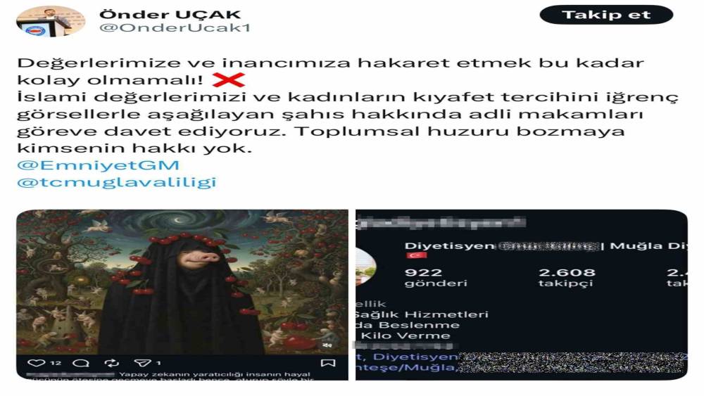 Muğla’nın Menteşe ilçesinde Diyetisyen O.K.’nin sosyal medya hesabından paylaşılan dini değerlere hakaret içerikli görsel tepki topladı. Eğitim Bir-Sen Muğla Şube Başkanı Önder Uçak adli makamları göreve davet ederken, paylaşımı yapan hesap kapatıldı. O.K. ise hesabının çalındığını ileri sürdü.