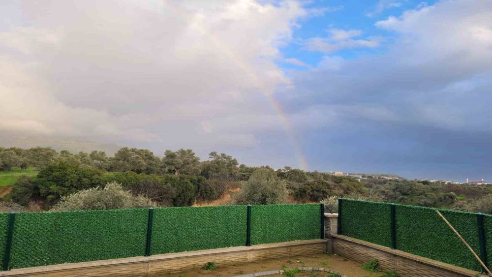 Aydın’ın Efeler ilçesinde etkili olan sağanak yağışın ardından ortaya çıkan gök kuşağı, gökyüzünde görsel şölen oluşturdu.