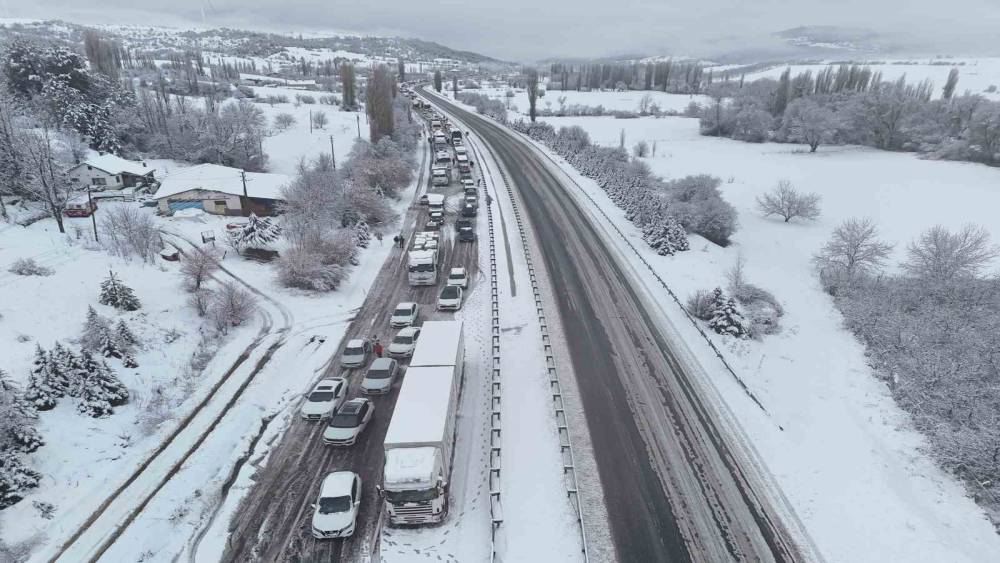 Yaklaşık 3 saat süren çalışmaların ardından yol yeniden trafiğe açılırken, Dumlupınar Rampaları’nda yolda kalan araçlar ve kilometrelerce oluşan trafik kuyruğu dron ile havadan görüntülendi.