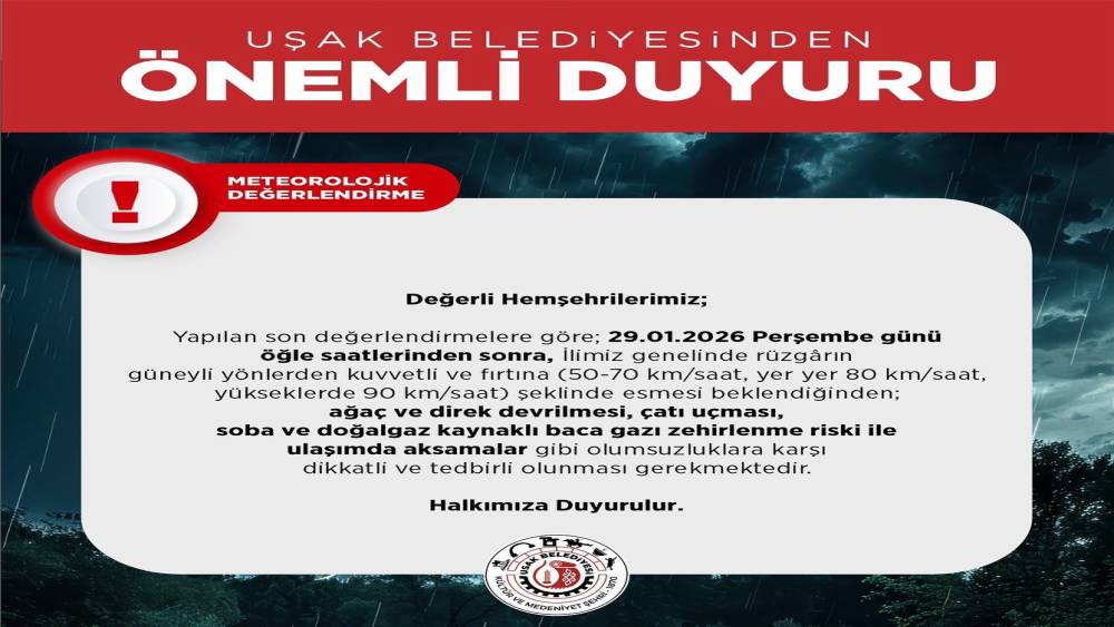 Uşak Valiliği ve Uşak Belediyesi, kent genelinde beklenen kuvvetli rüzgar ve fırtınaya karşı vatandaşları uyardı.Uşak Valiliği tarafından yapılan meteorolojik değerlendirmelere göre; 29 Ocak 2026 Perşembe günü öğle saatlerinden itibaren Afyonkarahisar, Uşak ve Denizli’yi kapsayan bölgede güney ve güneybatılı yönlerden kuvvetli rüzgar ve fırtına bekleniyor. Rüzgar hızının 50-70 km/saat, yer yer 80 km/saat, yüksek kesimlerde ise 90 km/saat seviyelerine ulaşabileceği bildirildi.Yetkililer, fırtına nedeniyle ulaşımda aksamalar, çatı uçması, ağaç ve direk devrilmesi, soba ve doğalgaz kaynaklı baca gazı zehirlenmeleri gibi olumsuzlukların yaşanabileceğine dikkat çekerek vatandaşların tedbirli olmalarını istedi. Uyarının 29 Ocak 2026 saat 12.00’de başlayıp, 30 Ocak 2026 saat 09.00’a kadar devam edeceği belirtildi.Uşak Belediyesi tarafından yapılan duyuruda da il genelinde etkili olması beklenen kuvvetli rüzgar ve fırtına nedeniyle benzer risklerin oluşabileceği ifade edilerek vatandaşlara dikkatli ve tedbirli olunması çağrısında bulunuldu.