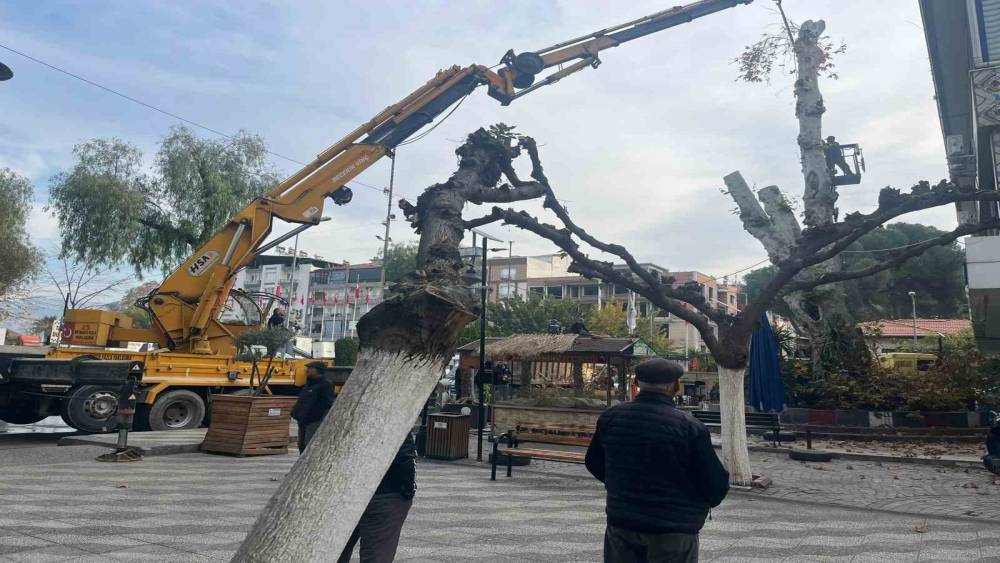 Aydın’ın İncirliova ilçesinde bulunan tarihi çınar ağacının devrilme riski taşıması nedeniyle belediye ekipleri tarafından budaması gerçekleştirildi.