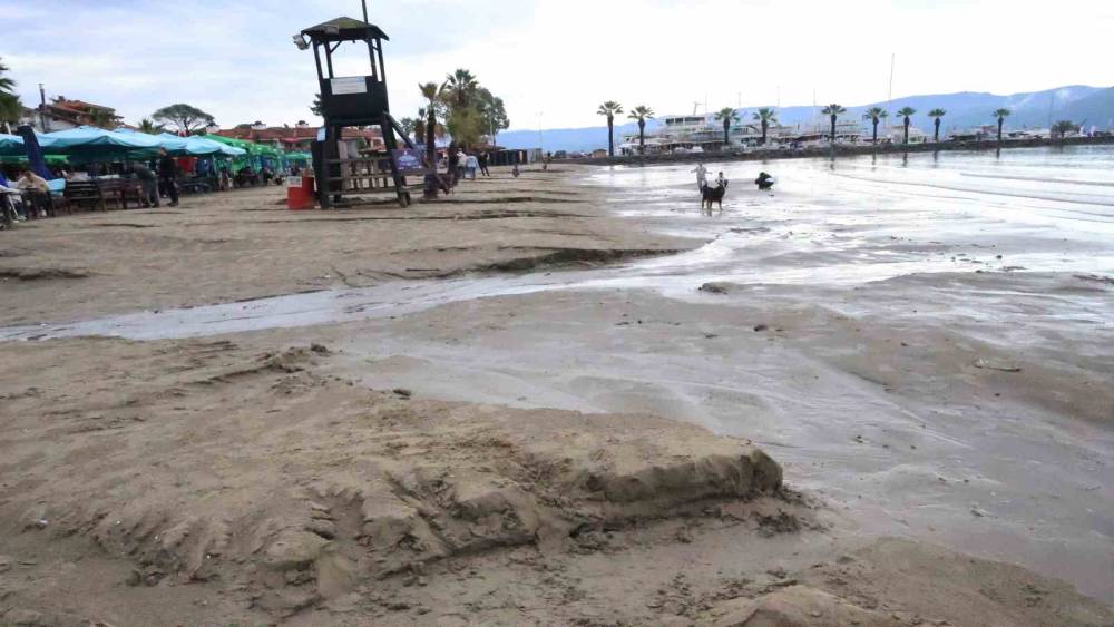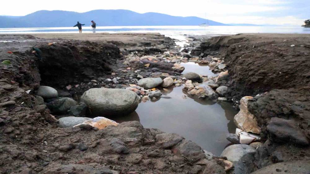 Gece saatlerinde başlayan sağanak yağmur öğle saatlerinde sona ererken, yağış nedeniyle Akyaka Mahallesi’nin iç kesimlerinden gelen yağmur suyu 300 metre uzunluğundaki Akyaka sahilinde sahil kumları denize sürüklendi ve sahilde yarıklar oluştu.