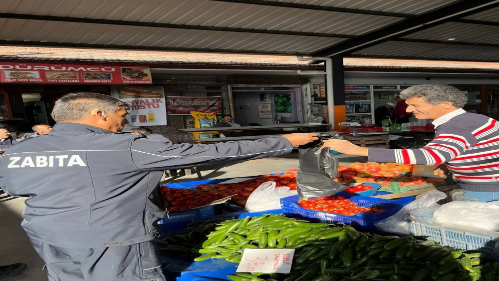 Zabıta ekiplerinden pazarcı esnafına çöp poşeti desteği